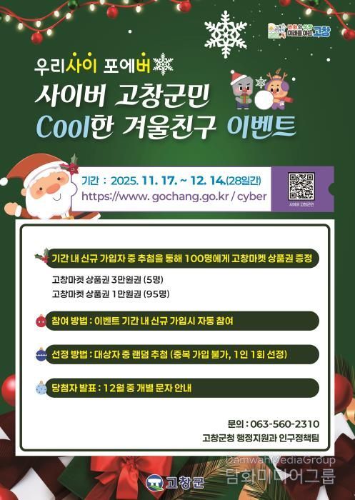 시민행정신문 강갑수 기자 | 고창군이 ‘사이버 고창군민’ 신규가입자를 대상으로 12월14일까지 쿨(Cool)한 겨울친구 이벤트를 진행한다고 밝혔다.