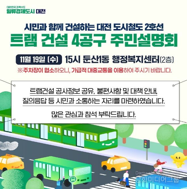 시민행정신문 강갑수 기자 | 대전시는 19일 오후 3시 둔산1동행정복지센터에서 도시철도 2호선 4공구(수정타운아파트~대전둔산경찰서) 건설공사와 관련한 주민설명회를 개최했다.