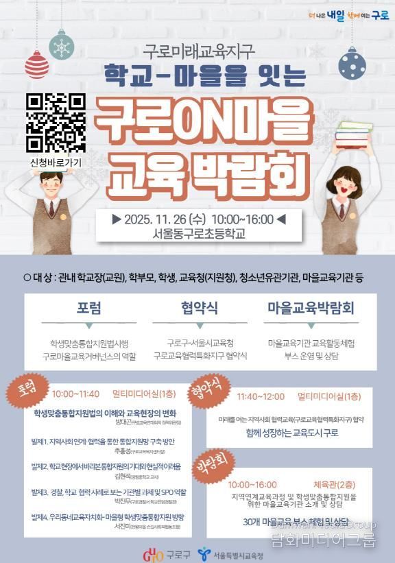 장인홍 구로구청장은 “학교와 마을이 함께 아이들의 성장을 지원하는 것은 지역의 미래를 만드는 일”이라며 “이번 박람회가 구로형 학생맞춤통합지원 모델을 구체화하는 계기가 되길 바란다”고 말했다.