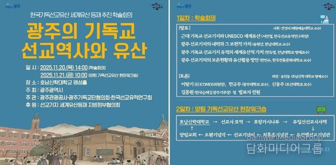 광주광역시는 20~21일 호남신학대학교 일원에서 ‘한국기독선교유산 세계유산 등재 추진을 위한 학술회의와 워크숍’을 열어 한국 근대 기독교 선교의 역사적 가치를 조명한다.