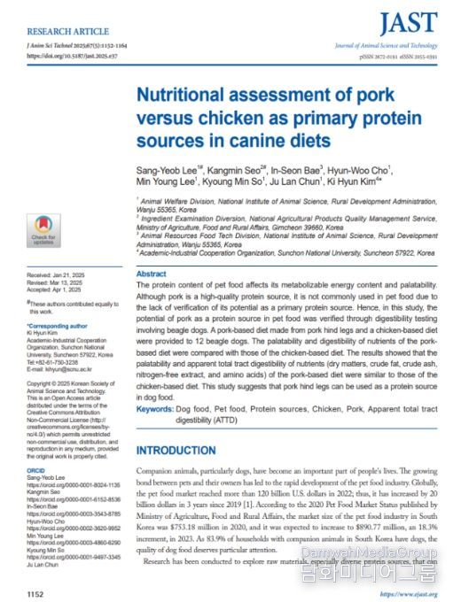 연구진은 비글견 12마리에게 닭고기 기반 사료와 돼지고기 뒷다리살을 단백질원으로 제조한 시험 사료를 각각 15일간 급여한 후, 소화율과 기호성을 비교 평가했다.