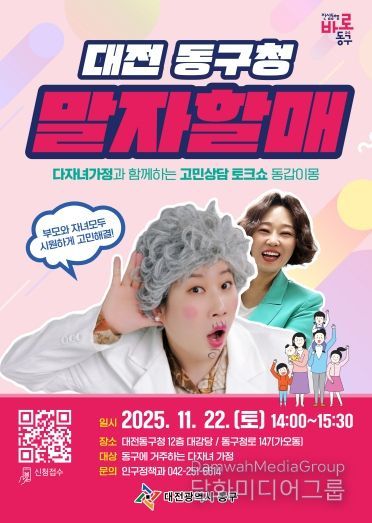 시민행정신문 강갑수 기자 | 대전 동구는 오는 22일 오후 2시 구청 12층 대강당에서 다자녀 가정을 위한 가족친화 프로그램 ‘말자할매와 함께하는 고민상담 토크쇼 동갑이몽’을 개최한다고 19일 밝혔다.