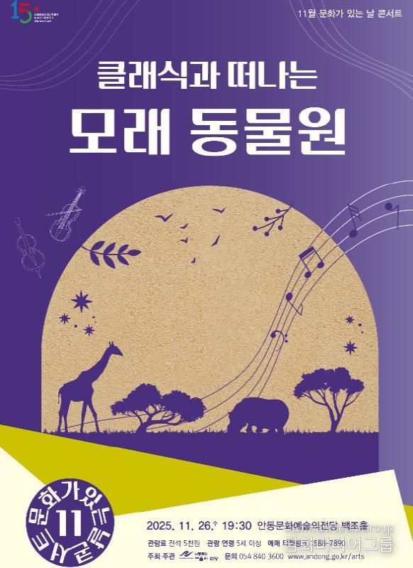 11월 문화가 있는 날 콘서트 '클래식과 떠나는 모래동물원'이 11월 26일 저녁 7시 30분 안동문화예술의전당 백조홀에서, 클래식 음악과 샌드아트가 결합된 이색적인 무대로 예술적 감동과 시각적 즐거움을 동시에 선사한다.