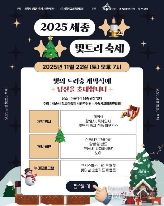 이번 축제를 준비하는 빛트리 축제 시민추진단 임인택 상임대표는 “세종 시민과 교회, 지역 공동체가 함께 만들어가는 빛트리축제가 세종의 겨울을 대표하는 축제로 자리 잡아가고 있다”며, “연말까지 가족과 이웃이 함께 따뜻함을 나누는 시간이 되길 바란다”고 말했다.