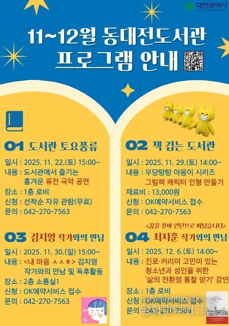 시민행정신문 강갑수 기자 | 대전시 동대전도서관은 2025년 연말을 맞아 11월부터 12월까지 어린이, 청소년, 성인 등을 대상으로 다양한 독서문화 프로그램을 준비했다.