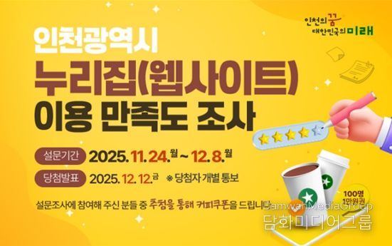 인천시는 설문조사에 참여한 시민들 중 100명을 추첨하여 모바일 음료 쿠폰을 지급할 예정이며, 당첨자 발표는 12월 12일 인천시 대표 누리집 공지사항에 게시하고 개별 문자를 통해서도 안내될 예정이다.