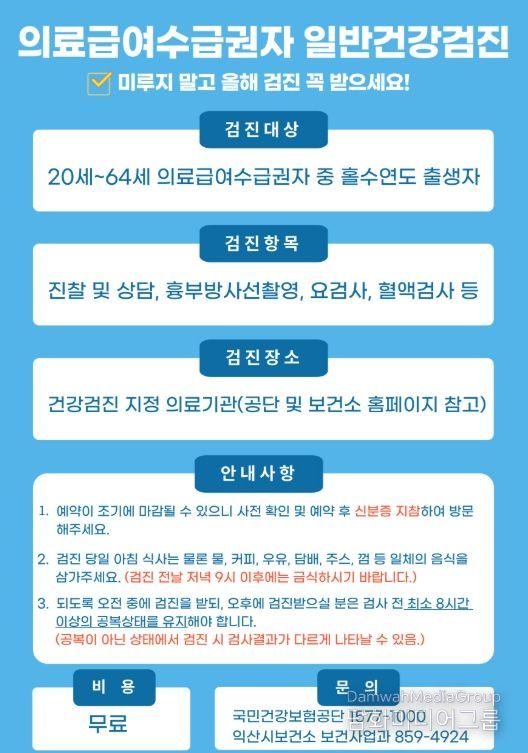 시민행정신문 강갑수 기자 | 익산시는 12월 31일까지 진행되는 '의료급여수급권자 일반건강검진'과 관련해 아직 검진을 받지 못한 대상자들에게 검진을 받을 것을 당부했다.