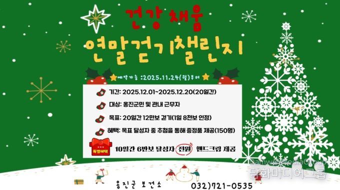 시민행정신문 기자 | 옹진군은 연말을 맞아 오는 12월 1일부터 20일까지 총 20일간 운영되는 12월 워크온 '건강채움, 연말걷기'챌린지 참가자를 24일부터 모집한다고 밝혔다.