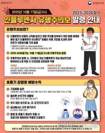 질병관리청은 10월 17일부터 2025-2026절기 인플루엔자 유행주의보를 발령했다. 전국적으로 확산 우려가 커지고 있다.
