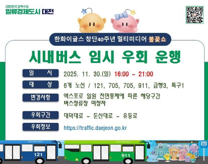 시민행정신문 강갑수 기자 | 대전시는 30일 개최되는 ‘한화이글스 창단 40주년 기념 불꽃쇼’에 대비해 엑스포로 일대 차량 통행을 전면 통제하고, 해당 구간을 지나는 시내버스 6개 노선을 임시 우회 운행한다.