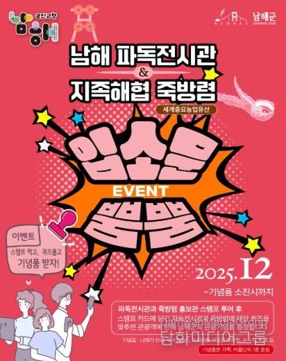 시민행정신문 강갑수 기자 | 남해군은 오는 12월 1일부터 파독전시관과 지족해협 죽방렴 전시관에서 ‘입소문 뿜뿜 이벤트’를 실시한다고 밝혔다.