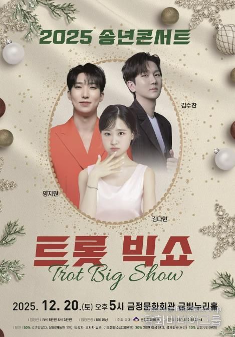 시민행정신문 기자 | 부산시 금정구는 2025년 12월 20일, 금정문화회관 금빛누리홀에서 대한민국 트롯계를 이끄는 가수 양지원, 김다현, 김수찬이 한자리에 모인 특별한 송년 콘서트 ‘트롯 빅쇼’를 선보인다고 26일 밝혔다.