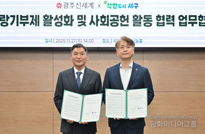 시민행정신문 강갑수 기자 | 광주광역시 서구가 지역 대표 기업과 함께 나눔문화 확산과 지역 활력 제고에 나선다. 서구는 27일 서구청 나눔홀에서 ㈜광주신세계(대표이사 이동훈)와 ‘광주 서구 고향사랑기부제 활성화 및 사회공헌 활동을 위한’ 업무협약을 체결했다.
