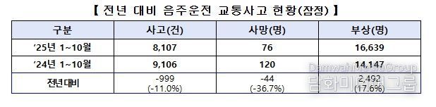 경찰청에서는 지속적인 음주운전 특별단속 및 집중 홍보, 음주 측정방해 행위(일명 술타기) 처벌 등의 영향으로 2025년 10월 31일 기준 음주 사고(-11.0%, 9,106건→8,107건) 및 사망자(-36.7%, 120명→76명)가 큰 폭으로 감소하고 있다.