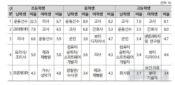 학교급별뿐만 아니라 성별 희망하는 직업에도 차이가 있었다. 교사는 초등학교 남학생을 제외한 모든 학교급의 성별에서 상위 5개 직업에 포함됐으며, 간호사는 중·고등학교 여학생의 희망직업에서 특히 높은 순위로 나타났다.