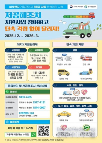 단, ▲긴급 ▲장애인 표지 부착 ▲저공해 조치 완료 차량 등은 단속 대상에서 제외된다. 만약 적발되더라도 2026년 9월 30일까지 저공해 조치를 완료할 경우 과태료를 면제받을 수 있다.