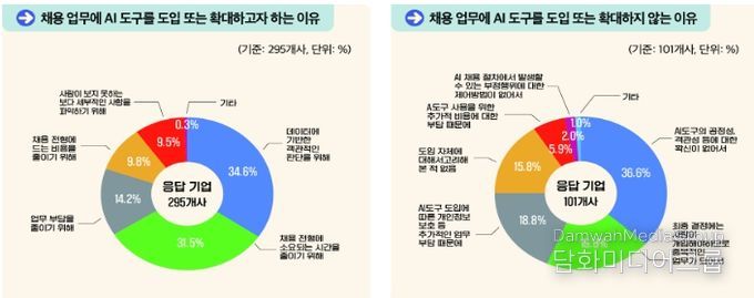 향후 채용 업무에 AI 도구를 도입·확대할 계획이 있는 기업은 74.5%(295개사)로 이들은 ‘AI 기반 인적성 또는 역량검사’(67.5%), ‘지원서류 검토’(63.4%), ‘채용 절차 관리’(55.6%) 등에 AI를 활용하겠다고 응답했다.
