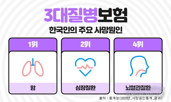 시민행정신문 이존영 기자 | 한국인의 주요 사망원인중에 암, 뇌혈관질환, 심혈관질환은 흔히 3대질병이라 일컬어지며 살아가면서 가장 먼저 대비해야 하는 중대질병으로 항상 강조되고 있다. 이들 질병에 미리 대비하기 위해 가입하는 것이 진단비보험인데, 이러한 3대질병진단비를 중점으로 보장하는 보장성보험이 3대진단비보험 이다. 3대질병진단비보험은 각각의 질병에 주목해서 보장하기도 하지만, 나에게 맞는 추가 특약을 잘 골라서 가입한다면 종합건강보험으로도 충분히 활용도가 높다.