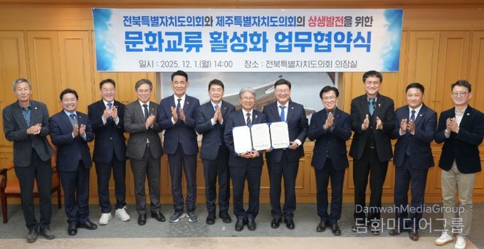 시민행정신문 강갑수 기자 | 전북특별자치도의회와 제주특별자치도의회는 문화·관광·세계유산 분야 협력을 강화하기 위해 1일 전북도의회 의장실에서 문화교류 활성화 업무협약(MOU)을 체결했다.
