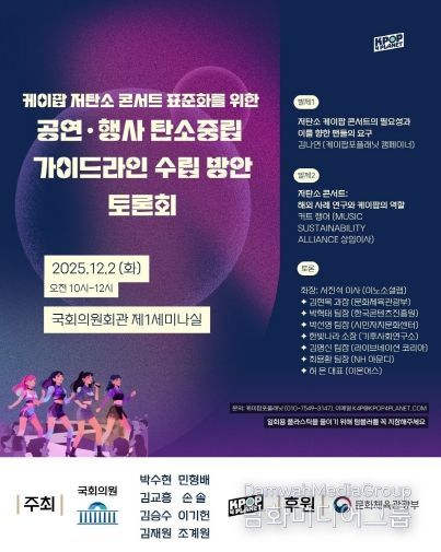 시민행정신문 이준석 기자 | 국회 문화체육관광위원회 박수현 의원(더불어민주당·충남 공주·부여·청양)은 12월 2일 (화) 오전 10시 국회의원회관 제1세미나실에서 문화체육관광위원회 김교흥 위원장, 김승수·김재원·민형배·손솔·이기헌·조계원 의원과 함께 ‘케이팝 저탄소 콘서트 표준화를 위한 공연 행사 탄소중립 가이드라인 토론회’를 개최한다.