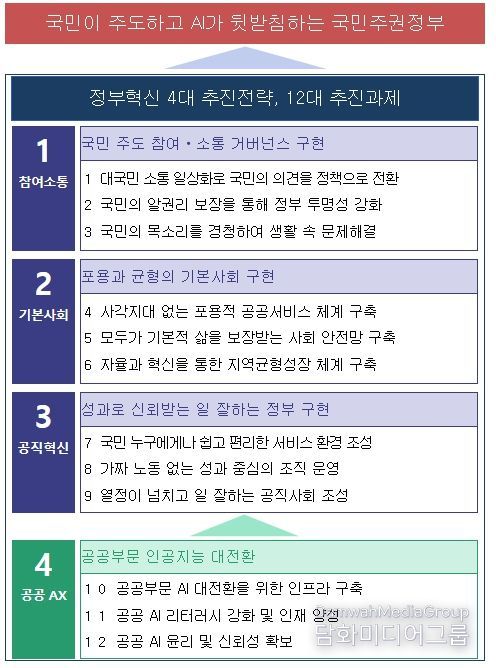 ▲국민 주도 참여·소통 거버넌스 구현, ▲포용과 균형의 기본사회 구현, ▲성과로 신뢰받는 일 잘하는 정부 구현, ▲공공부문 인공지능 대전환 등 4대 핵심 전략과 12개 세부 추진과제로 구성됐다.