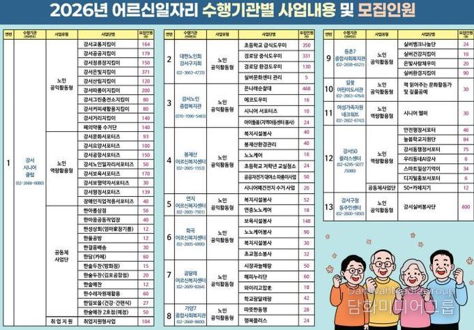 시민행정신문 강갑수 기자 | 서울 강서구가 ‘2026년 어르신일자리 및 사회활동 지원사업’ 참여자 6,083명을 오는 12일까지 모집한다.