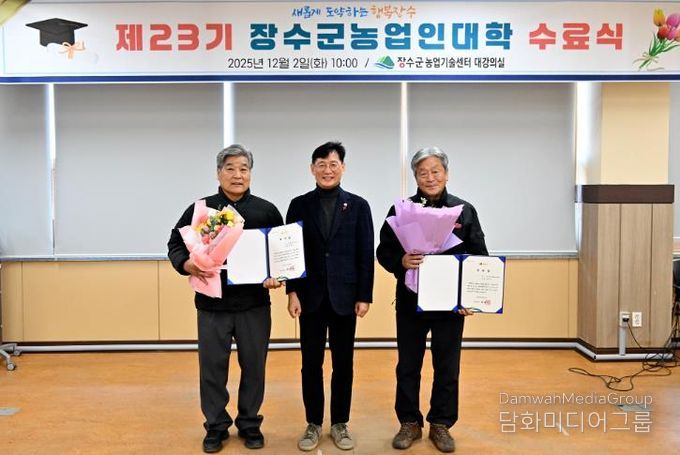 시민행정신문 강갑수 기자 | 장수군은 2일 장수군농업기술센터에서 최훈식 장수군수와 최한주 군의회 의장, 수료생 80여 명이 참석한 가운데 ‘제23기 장수군 농업인대학 수료식’을 개최했다고 밝혔다.