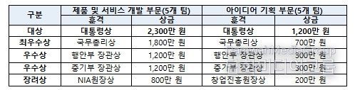 한편, 지난해에는 수출입 화물 실시간 추적 서비스 ‘쉬핑노트(Shipping Note)’를 개발한 관세청의 ‘지비티에스’팀과 산림양묘 병해충 예측 방제 정보제공 서비스인 ’시들링(seedling)’을 개발한 산림청의 ‘애프터레인’팀이 각각 대통령상을 수상했다.