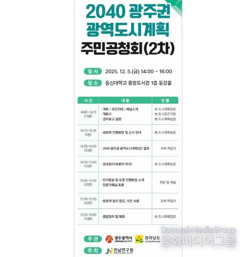 시민행정신문 강갑수 기자 | 광주광역시와 전라남도는 5일 전남 나주시 동신대학교 중앙도서관 동강홀에서 ‘2040 광주권 광역도시계획(안) 공청회’를 개최한다.