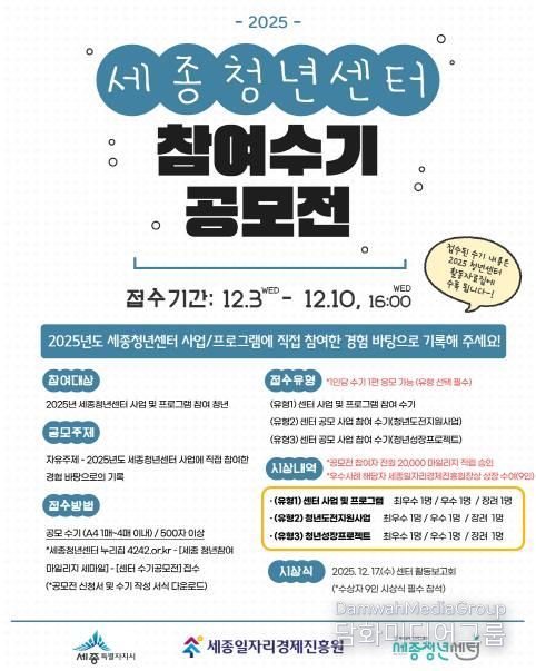 시민행정신문 강갑수 기자 | 세종일자리경제진흥원이 운영하는 세종청년센터가 센터 사업 및 프로그램 참여자들의 경험과 이야기를 담기 위한 ‘2025년 세종청년센터 참여 수기 공모전’을 개최한다.
