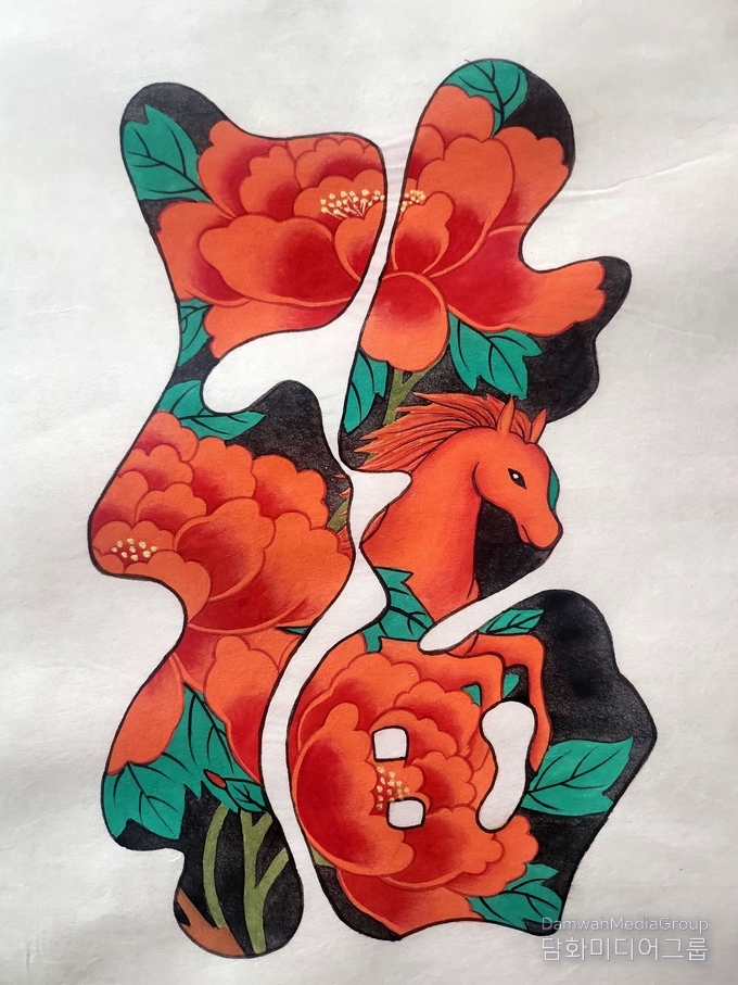 그것은 단순한 그림이 아니라, 2026년 한 해가 힘 있게 열릴 것이라는 상징적 메시지이기도 하다. 붉고 풍성한 모란꽃은 복의 기운이 이미 가득 차 있음을 말해준다. 또 다른 작품에서는 서로 다른 색의 모란이 어우러져 다복多福과 화합의 의미를 더한다.
