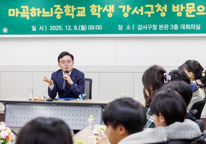 시민행정신문 강갑수 기자 | 진교훈 서울 강서구청장이 8일 구청 대회의실에서 마곡하늬중학교 3학년 학생들과 직접 대화하며 소통하는 시간을 가졌다.