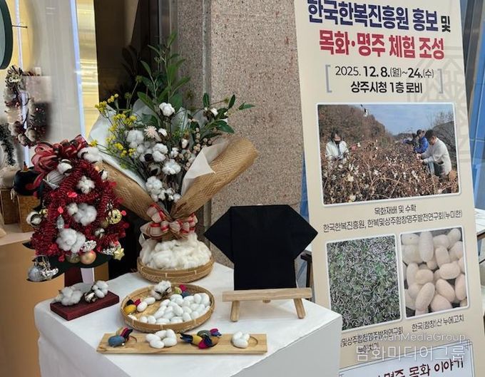 시민행정신문 강갑수 기자 | 한국한복진흥원 입주기업 누미한은 12월 8일부터 12월 24일까지 진흥원 내 목화밭에서 재배한 목화솜과 명주천을 활용한 체험형 전시를 상주시청 로비에서 진행한다.