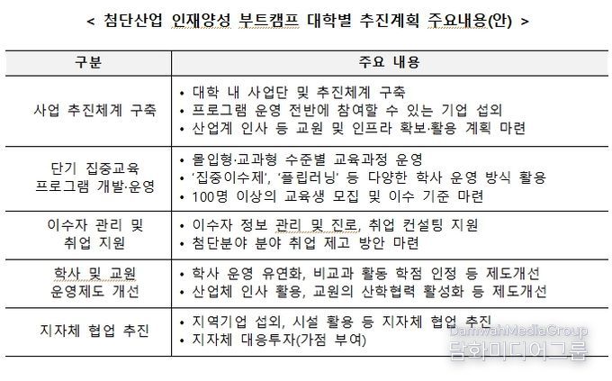 ‘첨단산업 인재양성 부트캠프’는 다양한 배경의 학생들이 대학과 기업이 공동으로 개발·운영하는 1년 이내 단기 집중교육을 통해 첨단분야 산업에 진출할 수 있도록 기획됐다. 2023년 반도체 분야 10개교를 시작으로, 2024년 이차전지, 디스플레이, 바이오, 항공우주 등 다양한 첨단분야로 확대하여 총 42교를 지원했다. 2025년에는 미래차, 인공지능(AI) 분야까지 확대하여 총 7개 분야, 47개교를 지원하고 있다.