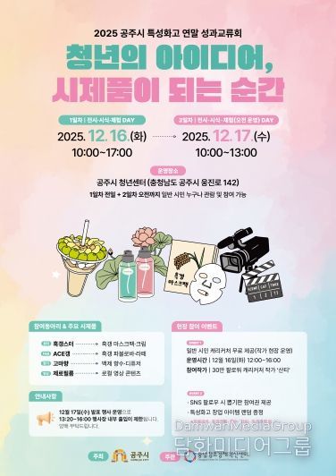 시민행정신문 이세훈 기자 | (재)충남창조경제혁신센터는'2025년 예비청년 특화사업 성장지원(교육특구 시범사업)'의 일환으로 추진 중인 특성화고 창업동아리 프로그램의 성과를 시민들과 공유하기 위해 ‘2025 특성화고 연말 성과교류회’를 12월 16일부터 17일까지 지역 청년센터에서 개최한다고 밝혔다.