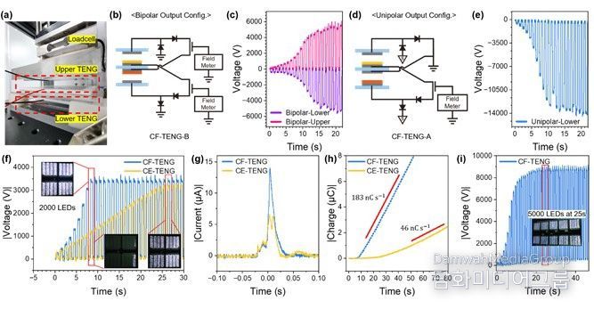 손바닥보다 조금 큰 10×10cm² 대면적 소자 실험에서는 양극성 모드에서 약 ±6kV, 단극성 모드에서 –14kV 전압을 약 8초 안에 만들어냈다. 연구팀은 이 소자로 LED 5000개가 연결된 어레이를 25초 만에 모두 점등하는 데도 성공했다.