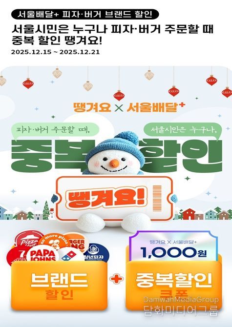 한편 피자헛, 도미노피자, 파파존스, 청년피자, 7번가피자, 노모어피자, 버거킹 등 7개 브랜드는 21일까지 ‘땡겨요’를 통해 브랜드별 할인쿠폰을 발행하는 공동 프로모션을 추진한다. 서울시는 국내 주요 피자·햄버거 프랜차이즈와 11월 27일 '서울배달+ 땡겨요 활성화를 위한 상생협약식'을 개최한 바 있다.