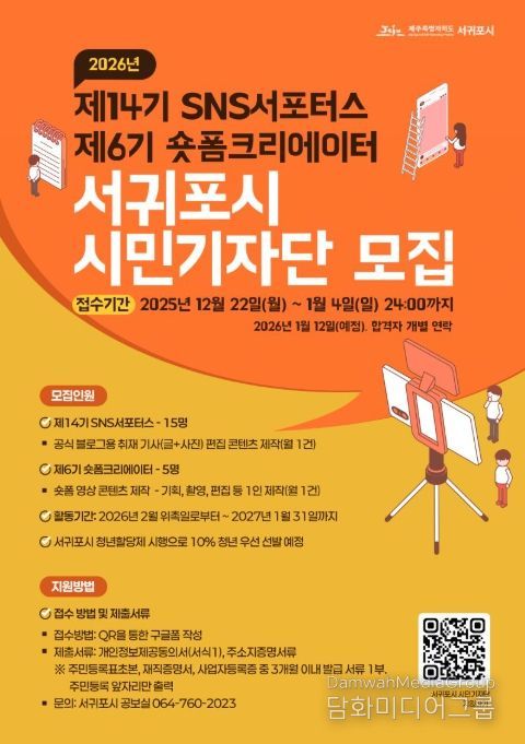 시민행정신문 강갑수 기자 | 서귀포시는 시민이 직접 참여하는 시정 홍보와 양방향 소통 강화를 위해 ‘2026 서귀포시 시민기자단(제14기 SNS서포터스·제6기 숏폼크리에이터)’을 모집한다고 밝혔다.