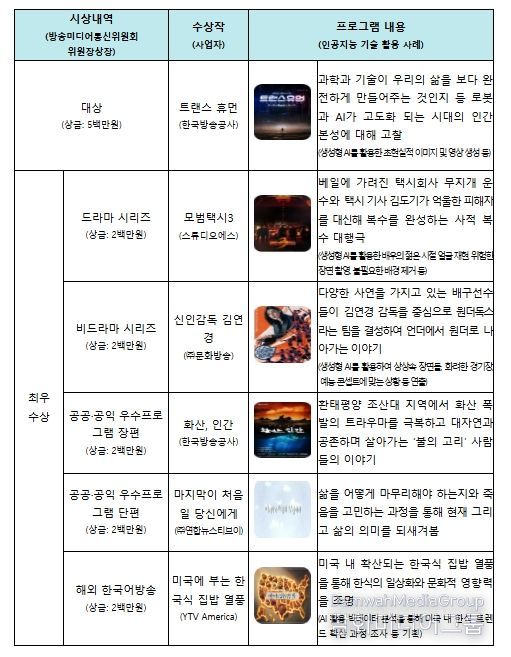 인공지능과 로봇 기술이 인간 정체성에 미치는 영향을 탐구한 한국방송공사(KBS)의 ‘트랜스 휴먼’이 대상을, ▲모범택시3(드라마) ▲신인감독 김연경(비드라마) ▲화산, 인간(공공‧공익 장편) ▲마지막이 처음일 당신에게(공공‧공익 단편) ▲미국에 부는 한국식 집밥 열풍(해외 한국어방송)이 최우수상을 수상했다.