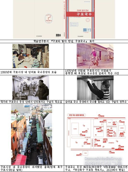 사진 자료에는 문헌자료, 국수 생산 장면, 구포시장 풍경 등을 수록하여 글자(텍스트)와 현장의 이미지를 함께 확인할 수 있도록 구성했다.