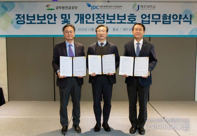 시민행정신문 강갑수 기자 | 제주국제자유도시개발센터는 12월 18일 공무원연금공단, 제주대학교와 함께 제주 지역 유관기관 정보보안 및 개인정보보호 분야 상호 협력체계 강화를 위한 업무협약을 체결했다.