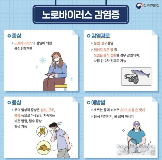 아울러 노로바이러스 감염증 환자는 증상이 호전된 이후에도 48시간 동안 등원·등교 및 출근을 자제해야 하며, 환자가 사용한 공간이나 화장실, 분변 또는 구토물에 오염된 물품은 락스 희석액을 사용해 철저히 소독해야 한다.