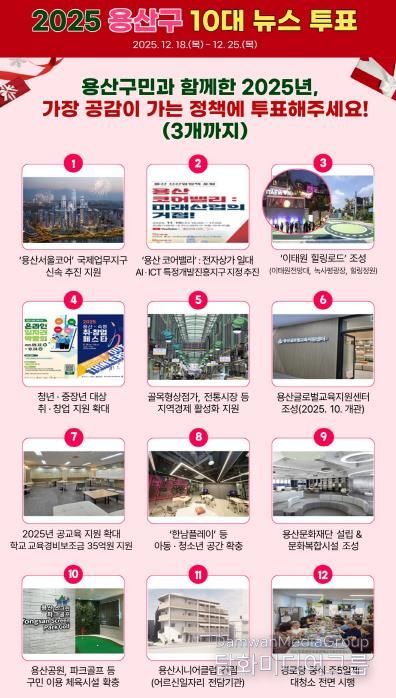 이번 투표에는 총 25개 주요 정책 사업이 후보로 올랐다. 참여 주민은 이 가운데 3개 사업을 선택하면 되며, 득표수를 합산해 상위 10개 사업을 ‘2025 용산구 10대 뉴스’로 최종 선정한다. 투표 결과는 12월 29일 용산구 누리집을 통해 발표될 예정이다.