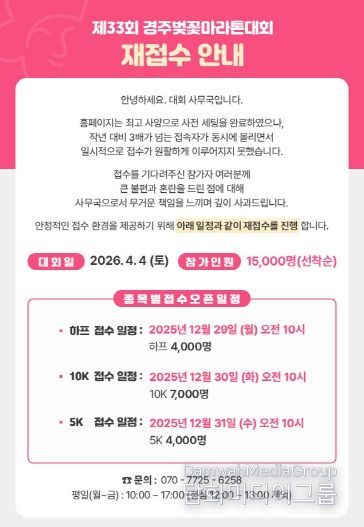경주시 관계자는 “전국 러너들의 높은 관심으로 접속이 일시적으로 집중됐다”며 “접수 지연으로 불편을 드린 점에 대해 양해를 구하고, 안정적인 접수와 안전한 대회 운영을 위해 만전을 기하겠다”고 말했다.