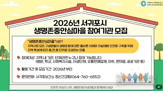 시민행정신문 기자 | 서귀포보건소는 2026년 생명존중안심마을에 새롭게 함께할 참여기관을 모집한다고 밝혔다. 생명존중안심마을은 마을별 생명존중 네트워크를 형성하는 핵심 사업으로, 보건의료․교육․사회복지․지역사회․공공기관의 5가지 영역별 참여기관이 함께하며 마을 내 생명존중 문화 조성을 위해 협력하는 사업이다.