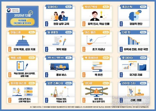 조사 결과 국민이 우리말로 바꾸어 써야 한다고 가장 많이 꼽은 외래 용어는 ‘오제이티’(76.6%)와 ‘빅샷/빅숏’(76.5%), ‘휴리스틱’(74.9%), ‘마일스톤’(74.1%), ‘딜 클로징’(73.5%)이었다. 이에 따라 ‘오제이티’는 ‘현장 실무 교육’으로, ‘빅샷/빅숏’은 ‘유력 인사’ 또는 ‘핵심 인물’로, ‘휴리스틱’은 ‘경험적 판단’으로, 업무 추진 단계에서 기준이 되는 ‘마일스톤’은 ‘단계 목표’ 또는 ‘성과 지표’로, 계약 성사 과정을 뜻하는 ‘딜 클로징’은 ‘계약 체결’로 이해하기 쉽게 다듬었다.