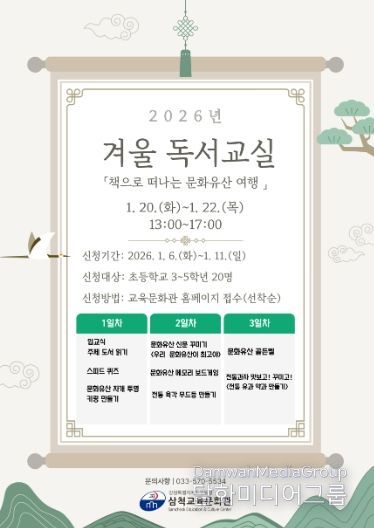 시민행정신문 기자 | 삼척교육문화관은 1월 20일부터 1월 22일까지 초등3~5학년을 대상으로 ‘2026년 겨울 독서교실: 책으로 떠나는 문화유산 여행’을 운영한다고 밝혔다.