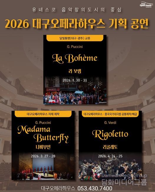 2026년 상반기에 대구오페라하우스는 푸치니 오페라 '라 보엠', '나비부인' 그리고 베르디 오페라 '리골레토'로 관객들을 만난다. 이어서 하반기에 있을 ‘제23회 대구국제오페라축제’는 야외 오페라를 시작으로, 지역 내 공연장들과 협력하여 폭 넓고, 다양한 무대에서 공연을 선보일 예정이다.