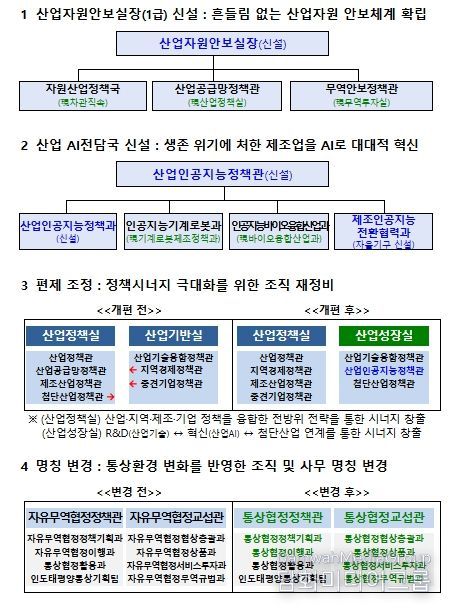 이번 조직개편은 국민주권정부 국정과제의 속도감 있는 이행을 위한 조직 기능 강화와 에너지기능 분리 이후 자원산업 재배치, 지역 성장 및 기업 활력 제고 등 정책시너지 창출을 위한 조직 재정비 차원에서 마련됐다.