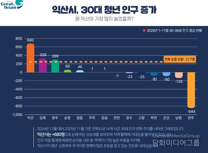 지난해 12월 대비 올해 11월 익산의 30대 인구는 680명 증가했다.